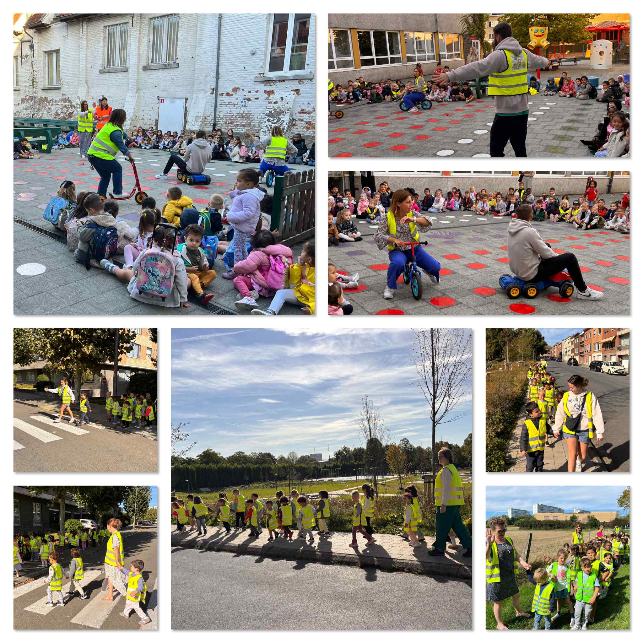 Na het toneel over verkeersveiligheid gingen de kleuters wandelen rond de school. Onderweg stonden we stil bij het zebrapad, de verkeersregels en het belang van ons fluohesje.