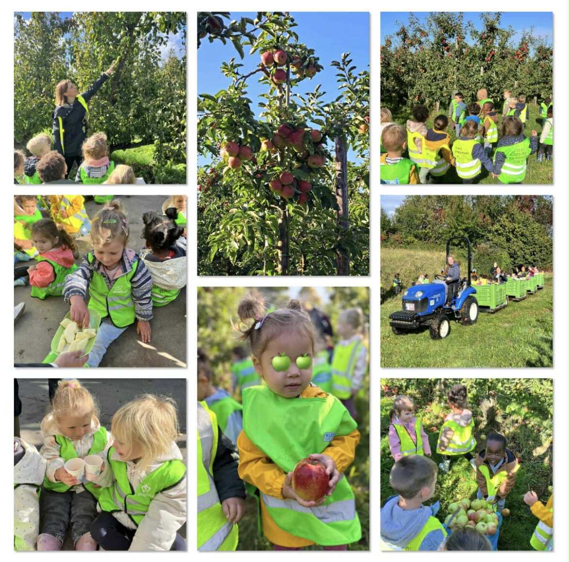 De kleuters van de onthaal- en eerste kleuterklas trokken er samen op uit naar de boomgaard. Ze ontdekten waar appels vandaan komen en hoe ze groeien. Daarna mochten ze gezellig mee op de tractor voor een tochtje tussen de appel- en perenbomen. Natuurlijk werd er ook geproefd: knapperige appels en een heerlijk appelsapje! Als kers op de taart mochten de kinderen enkele appels meenemen naar de klas, waar ze er nog creatief mee aan de slag gaan.